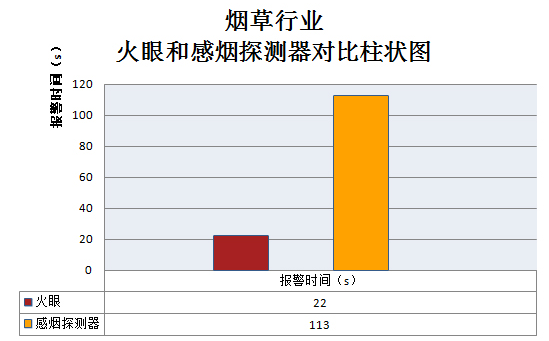 2014年“火眼”技術(shù)成功安裝于上海煙草集團,共做火焰測試46次,報警時間:14~62秒,平均時間:41秒;煙霧測試27次,報警時間:8~99秒,平均時間37秒。 “火眼”技術(shù)和煙草行業(yè)中不同場所使用的感煙探測器對比試驗5次: “火眼”技術(shù)平均報警時間:22秒; 感煙探測器報警時間:113秒。